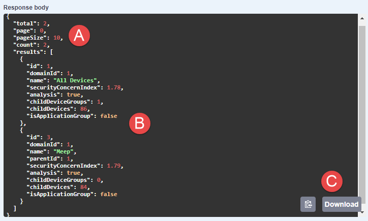 The example below shows the response body for the GET/domain/{domainId}/deviceGroup (located in the Device Group element) endpoint on the Enterprise domain.