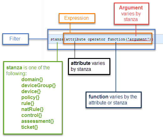 | Expression | The combination of attribute, operator, function, and argument that appears inside of curly brackets. You can include one or more expressions in a single filter. | After the stanza. |